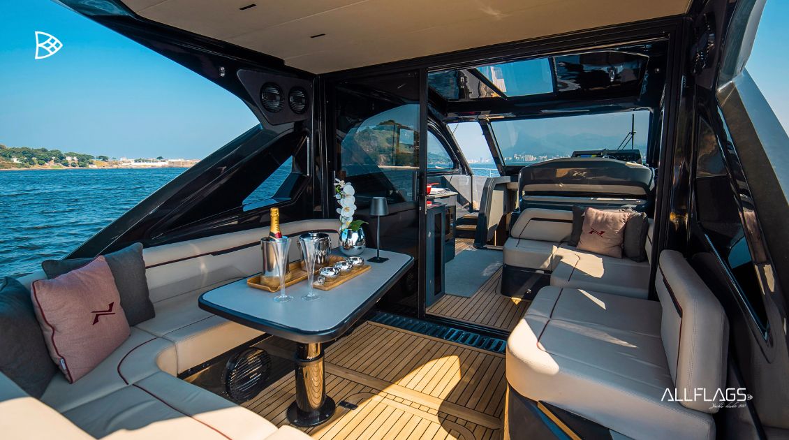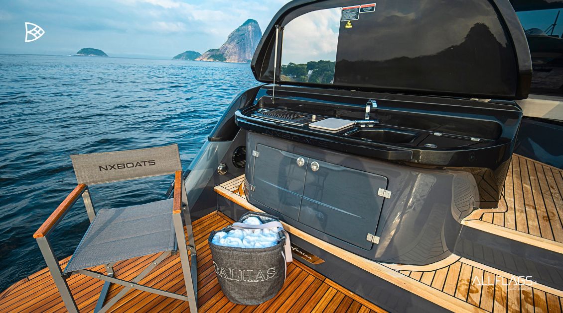 Na área de popa, o espaço foi pensado para receber com estilo, enquanto o layout otimizado integra áreas sociais e funcionais, elevando a experiência de lazer com praticidade e sofisticação.