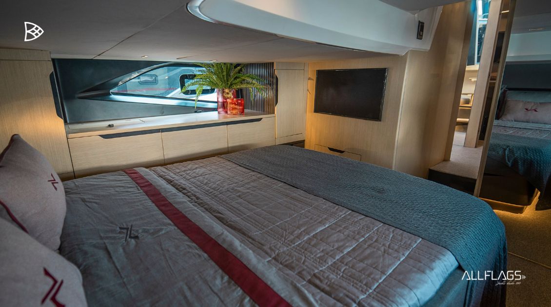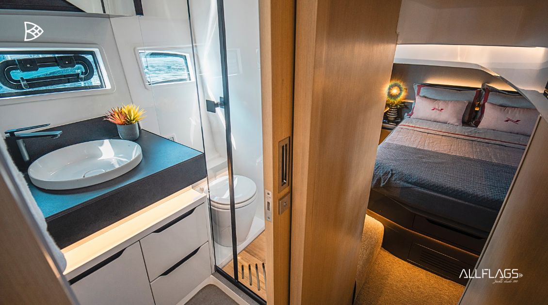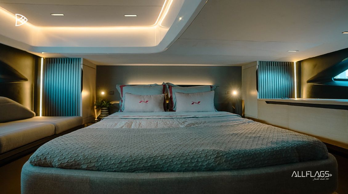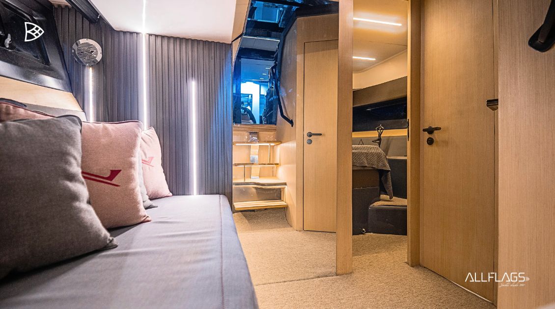 No interior, o padrão de acabamento segue a assinatura Pininfarina: materiais nobres, iluminação natural e um design contemporâneo que equilibra estética e funcionalidade. Cada ambiente convida ao conforto, seja em pernoites ou longas permanências a bordo.