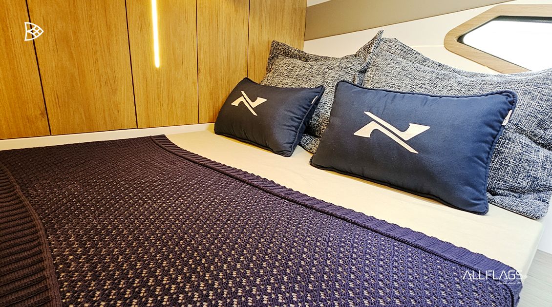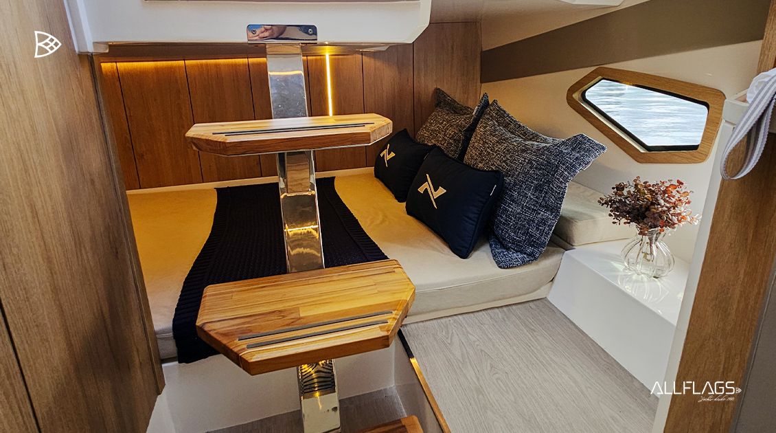 O cockpit amplo e bem distribuído acomoda os convidados com conforto em sofás generosos e mesa central removível, facilitando a circulação. Sob os assentos, há bons compartimentos de armazenamento. O modelo é homologado para 14 passageiros em passeios diurnos e 4 para pernoite, atendendo perfeitamente aos passeios em família ou entre amigos.