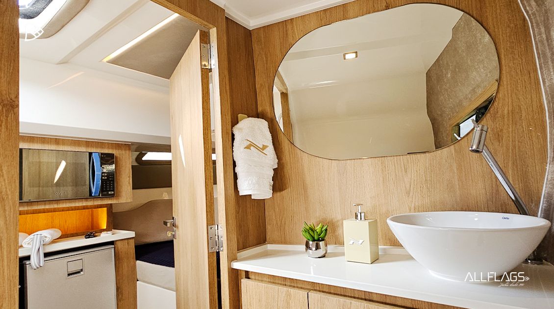 Outro diferencial importante é o acabamento em corian, um material nobre amplamente utilizado em embarcações premium. Além do visual moderno e sofisticado, o corian oferece alta durabilidade, facilidade de limpeza e menor necessidade de manutenção ao longo do tempo.